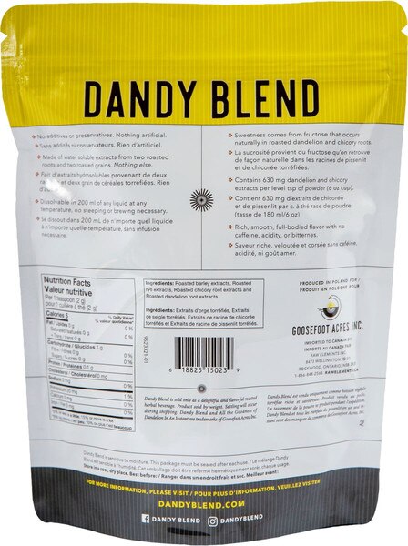 Dandy Blend instant dandelion beverage is the only herbal coffee substitute that offers the health benefits of dandelion and the rich, full bodied-flavour and smooth texture of real coffee. Macrobiotic, gluten-free and caffeine-free it is a great coffee alternative to add to your mornings.