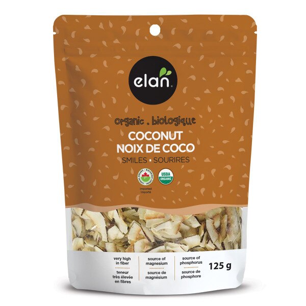 Elan Organic Coconut Smiles, are crunchy, lightly toasted and highly addictive. They are unsweetened to let their subtle natural, nutty flavor shine. They're great in your baking recipes or as a topping for cereal, yogurt and smoothies. Bring them with you and eat them right from your backpack or hand bag as a nutritious on-the-go snack.