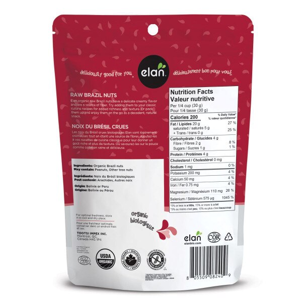 Elan Organic Raw Brazil Nuts have a delicate creamy flavour and are a source of fiber. Unlike crunchy, roasted nuts, these raw untreated Brazil nuts are fresh and delicious. Try adding them to your classic cuisine recipes for added rich flavor and texture. Or pack them up and eat them on-the-go as a decadent, natural snack.