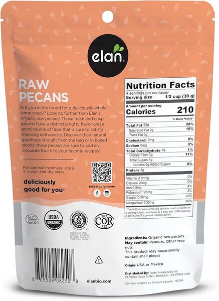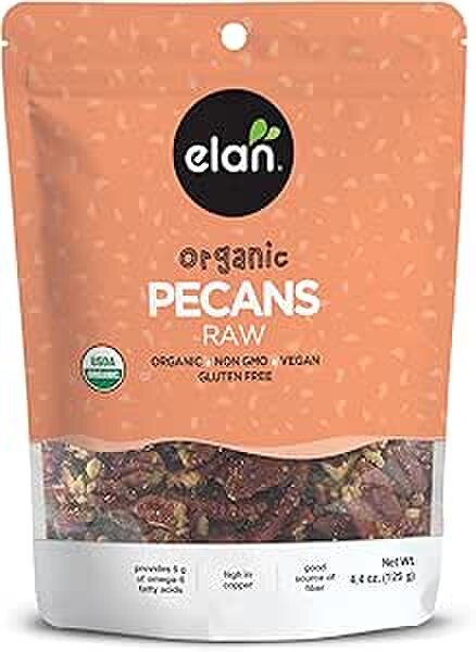 Elan Organic Raw Pecans have a delicious earthy flavor and are a good source of fiber. Unlike roasted nuts, these untreated raw pecans are fresh, crisp and richly flavored. They bring a distinct, nutty flavor to your baked goods and classic cuisine recipes. Try them straight out of the bag as a wholesome snack.