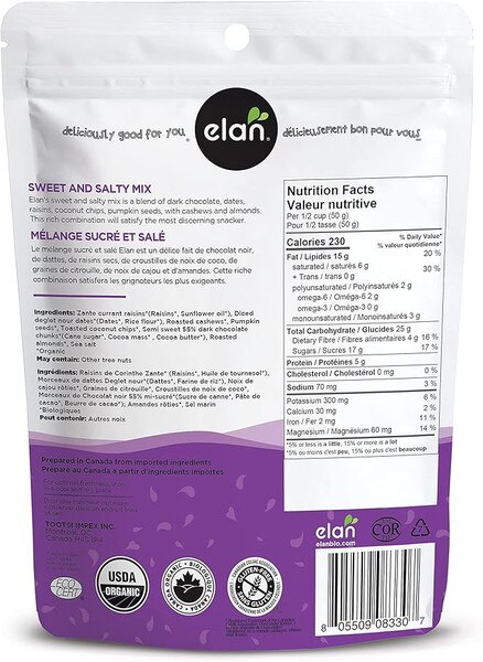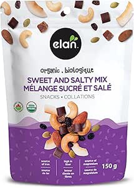 Elan Sweet and Salty Mix is a rich blend of rich dark chocolate, organic dates, raisins, coconut chips, pumpkin seeds, with cashews and almonds that have been lightly roasted and salted to perfection. This rich combination of organic nuts, fruits and chocolate will satisfy the most discerning snacker at home or on the go.