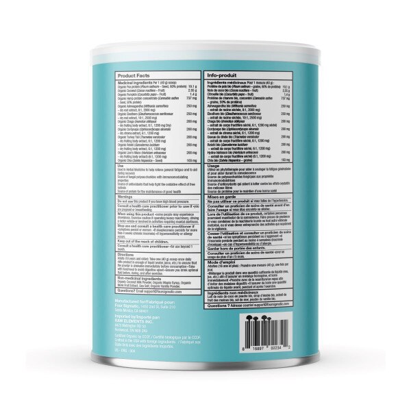 Organic Pea protein, Organic Coconut, Organic Pumpkin, ORgani Hemp protein concentrate, Organic Ashwagandha, Organic Eleuthero, Organic Chaga, Organic Cordyceps, Organic Turkey Tail, Organic Reishi, Organic Lion's Mane, Organic Chai