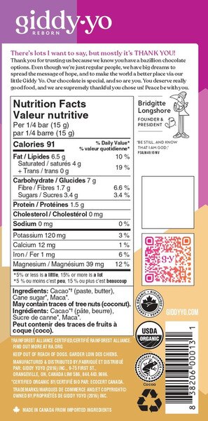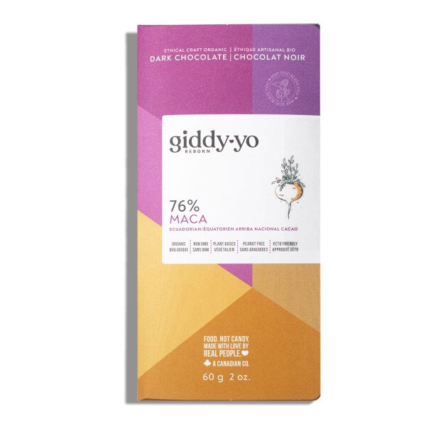 Organic Maca 76% Dark Chocolate Bar. Our 76% Maca is an amped up version of our 76% Original bar- heirloom specialty cacao, award-winning cane and just enough Giddy Yo maca to give this bar a boost! People that usually don’t like maca love this malty-caramelly super smooth bar. It is purported that MACA is a natural aphrodisiac, energy enhancer, libido booster, hormone balancer (and so much more) for men and women.