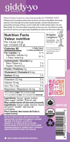 Organic Cacao (Paste, Butter), Biodynamic Golden Cane, Organic Ground Vanilla Beans, Maras Pink Mt. Salt.
