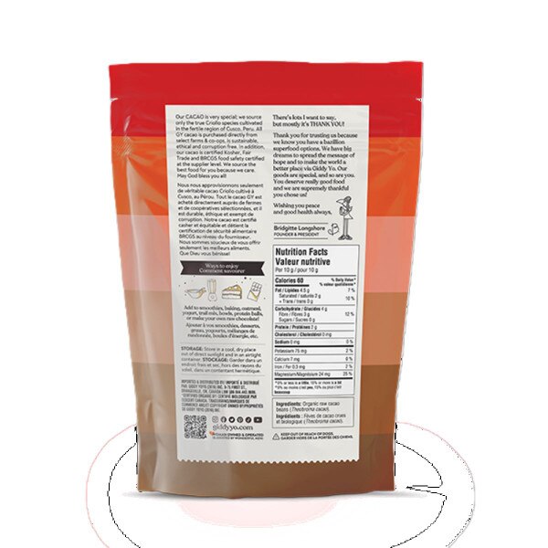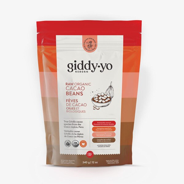 Giddy-Yo Cacao Beans are very special! Giddy-Yo sources only the true Criollo species cultivated in the fertile region of Cusco, Peru. Our raw beans are certified organic, Fairly traded, common allergen-free, non GMO, naturally vegan and delicious! The beans are hand-selected, fermented and dried to perfection keeping the cacao skin intact. Our cacao is lab tested, clean and pure, and does not go through a “Dutch” process nor alkalized in any way. Giddy Yo Cacao beans are naturally processed at low temps from start to finish to maximize quality and taste while maintaining nutritional integrity. Fairly Traded, Organic, Vegan, Keto, Non GMO, and Gluten Free Free of Gluten, Nuts, Dairy, Soy, and Refined Sugar Product of Peru Suggested use: Eat straight out of the bag or add to smoothies, desserts, oatmeal, yogurt, trail mix, power ball snacks, or make your own raw chocolate. Store in a cool, dry place-out of direct sunlight and in an airtight container.