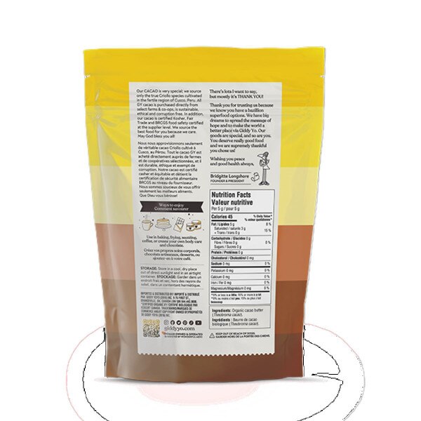 Giddy-Yo’s Cacao is very special! Giddy-Yo sources only the true Criollo species cultivated in the fertile region of Cusco, Peru. Our raw beans are certified organic, Fairly traded, common allergen-free, non GMO, naturally vegan and delicious! Our cacao is hand-selected, fermented and dried to perfection, crushed into nibs, the skins removed or ‘winnowed’ and ground into a liquid. The liquefied cacao mass is transferred to a mechanical press where the majority of cacao butter is removed, solidified and packaged for your enjoyment. Our cacao butter is lab tested, clean and pure, is not deodorized nor treated with toxic chemicals. Giddy Yo cacao butter is low temperature processed from start to finish to maximize quality and taste while maintaining nutritional integrity. Fairly Traded, Organic, Vegan, Keto, Non GMO, and Gluten Free Free of Gluten, Nuts, Dairy, Soy, and Refined Sugar Product of Peru Suggested use: Create your own body care, handmade chocolate, desserts, or grate into hot beverages (coffee, chaga tea, elixirs, hot chocolate etc.). Use in your cooking (great for frying) and baking (brownies, cakes, cookies, etc.), and various other desserts. You’ll definitely want to try making your own dark chocolate by adding GY cacao butter to our powder or paste, and sweeten with honey or maple syrup if preferred. Store in a cool, dry place-out of direct sunlight and in an airtight container.