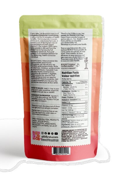 Organic Camu Camu Powder. CAMU CAMU is a superfood champion originating from the Amazonian rainforest in Peru. Camu contains a myriad of nutrients and powerful plant compounds, but is best known as one of the most concentrated botanical sources of Vitamin C in the world (2–3% of fresh weight). Our camu originates in the mineral rich soil of the Amazonian Rainforest, is organic, vegan, gluten free and low temperature processed. It takes 5.6 kg of fresh fruit (including the skins and seeds) to make 1 kg of Giddy Yo dried camu camu powder. 1.5 tsp. (5g) of Giddy Camu Camu contains approximately 880% of the RDI of Vitamin C.