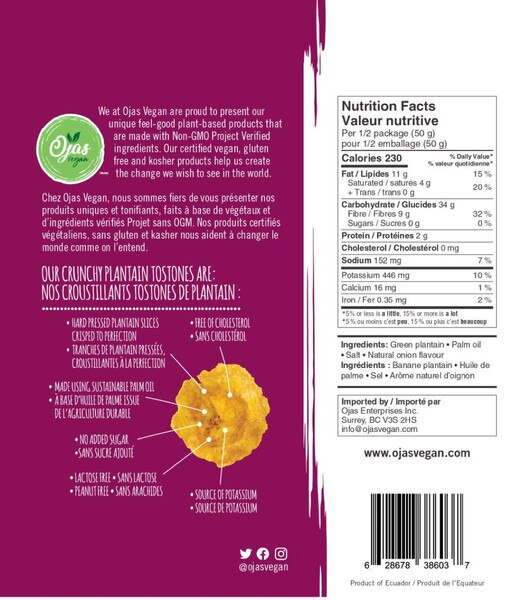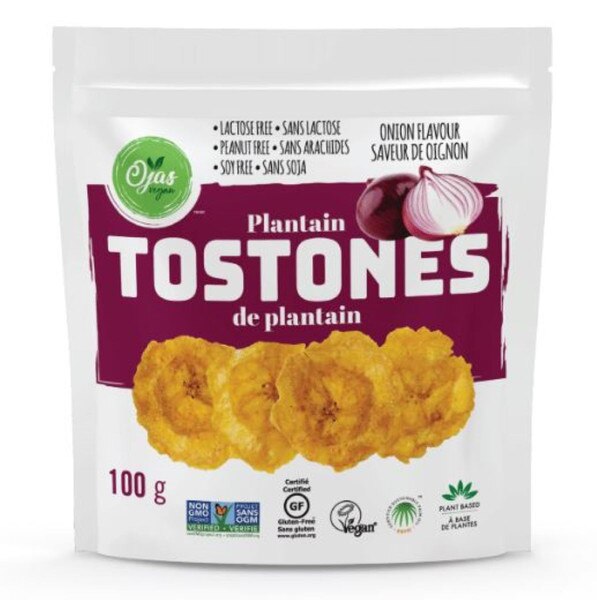 Crunchy and delicious, these ripe plantain tostones are a unique feel-good plant-based product that are made with Non-GMO Project Verified ingredients. They certified vegan, gluten free and kosher. These hard pressed plantains are crisped to perfection are packed with flavour but are cholesterol free and contain 0g of added sugar.