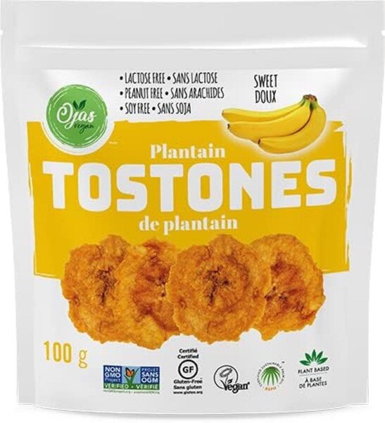 Crunchy and delicious, these ripe plantain tostones are a unique feel-good plant-based product that are made with Non-GMO Project Verified ingredients. They certified vegan, gluten free and kosher. These hard pressed plantains are crisped to perfection are packed with flavour but are cholesterol free and contain 0g of added sugar.