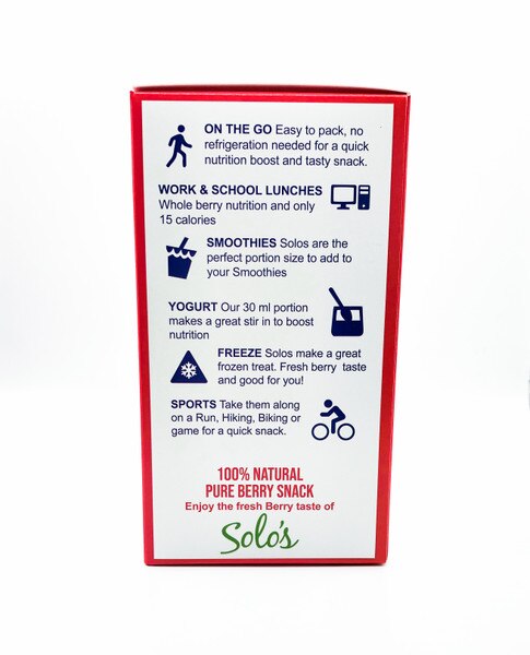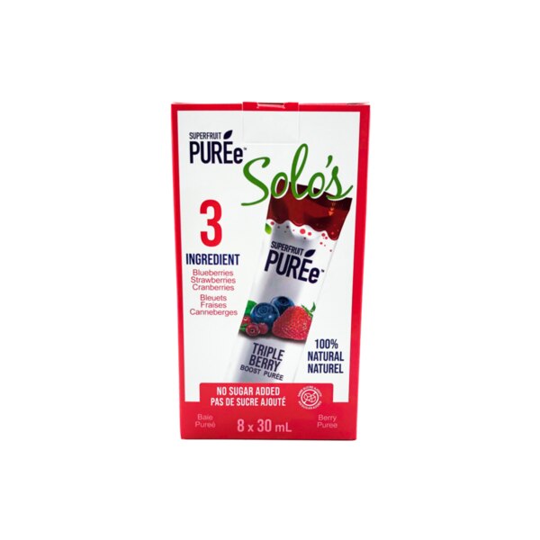 Superfruit Purée’s Triple Berry Solo’s are a naturally delicious, convenient snack that boast whole wild blueberries, cranberries and strawberries, and 100% of your daily antioxidants in a single serving. With only 15 calories and no added sugar or preservatives, this makes Superfruit Solo’s healthy snack perfection at home, on-the-go, school, work or play!. Enjoy the burst of berry flavour and nutrients – try Superfruit Triple Berry Solo’s straight-up, in your smoothie or yogurt, or freeze for a fantastic frozen (and good for you) treat.